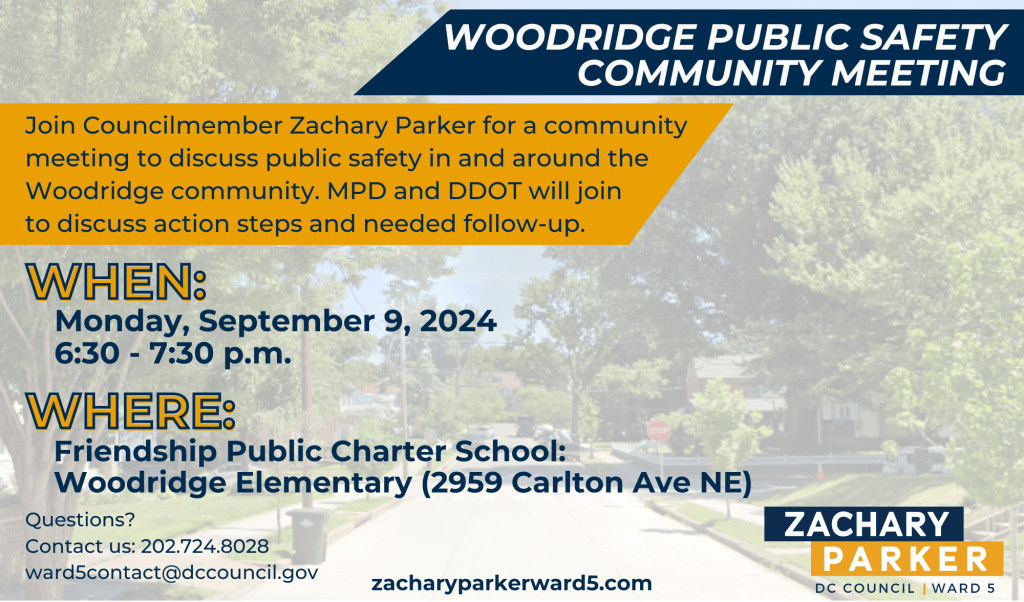 Woodridge Public Safety Community Meeting, When: Monday, September 9, 2024 at 6:30-7:30 pm. Where: Friendship PCS Woodridge Elementary (2959 Carlton Ave NE), 20018