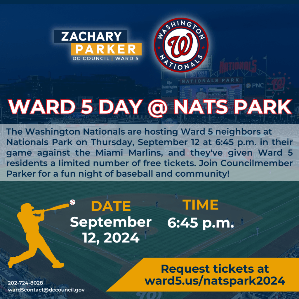 Ward 5 Day with Councilmember Zachary Parker at Nationals Park: Thursday, September 12, 2024 at 6:45 pm. Where: Nationals Park, Navy Yard, DC