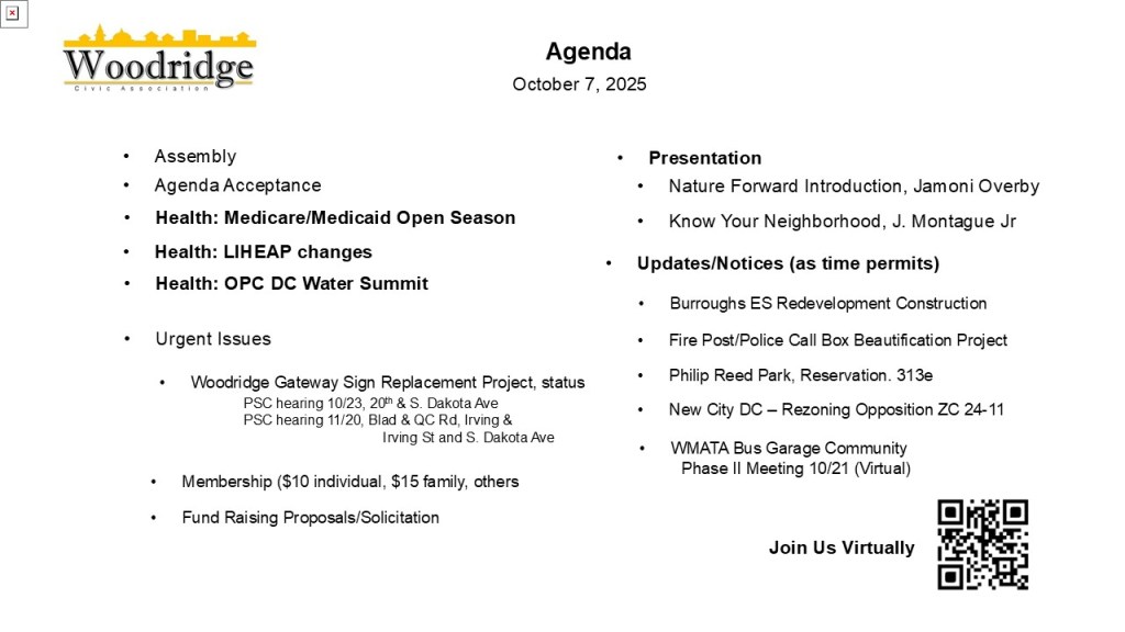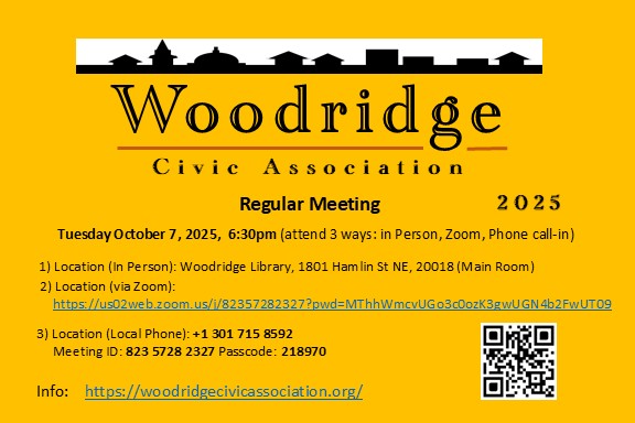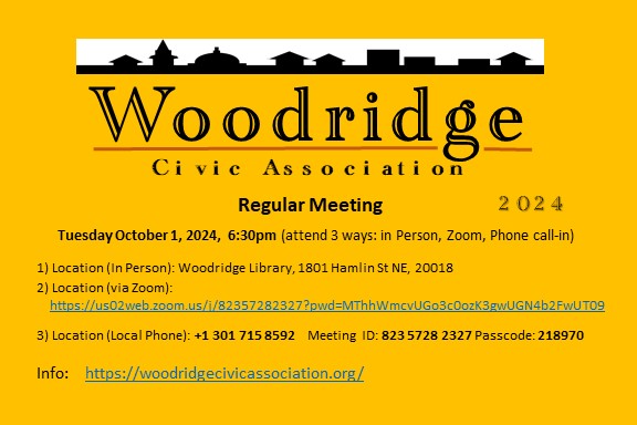 Woodridge Civic Association Regular Meeting, in-person, via Zoom Teleconference, and via Telephone call-in, Tuesday, October 1, 2024 6:30 pm, Woodridge Library, 1801 Hamlin St NE, 20018
