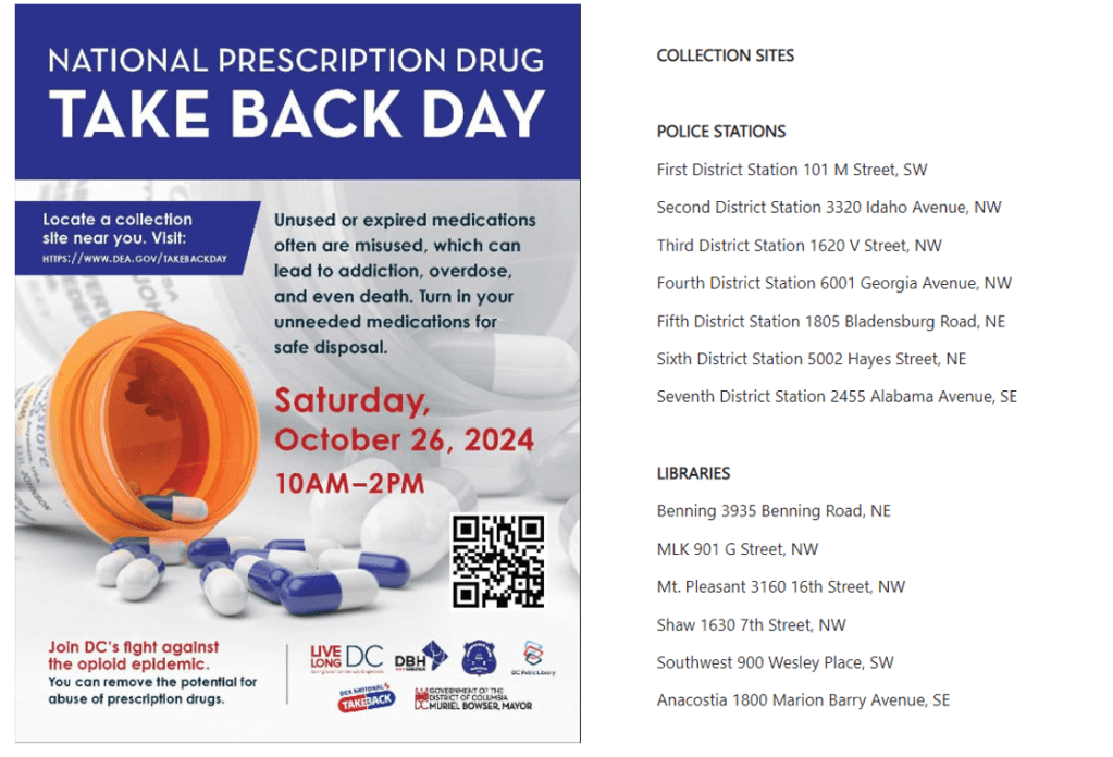 National Prescription Drug Take Back Day, October 26, 2024, 10am – 2pm, see graphic for participating locations, police stations, libraries image, or Drop-Off Sites following the image
