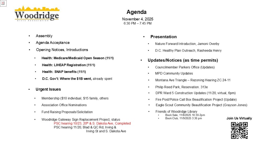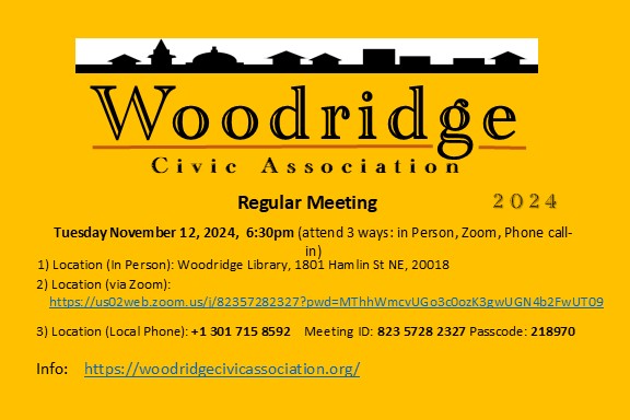 Woodridge Civic Association Regular Meeting, in-person, via Zoom Teleconference, and via Telephone call-in, Tuesday, November 12, 2024 6:30 pm, Woodridge Library, 1801 Hamlin St NE, 20018