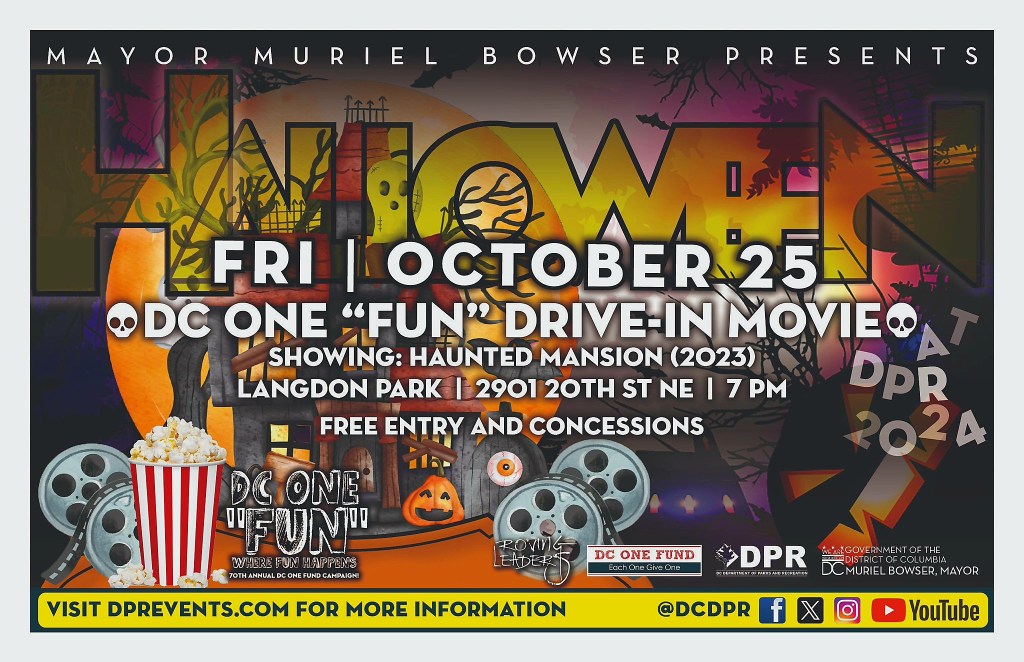 Mayor Bowser Presents, DC ONE “Fun” Drive-In Movie, October 25, 2024, 7pm, 2901 20th St NE, Free Entry/Free Concessions; Showing “Haunted Mansion” (2023), more info: visit DPRevents.com