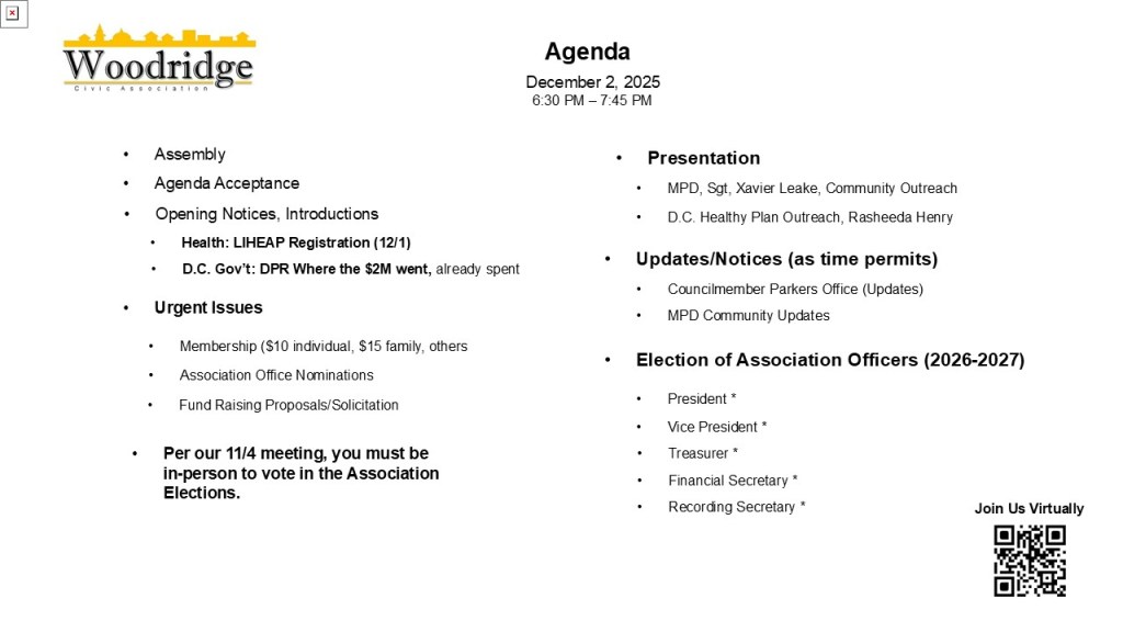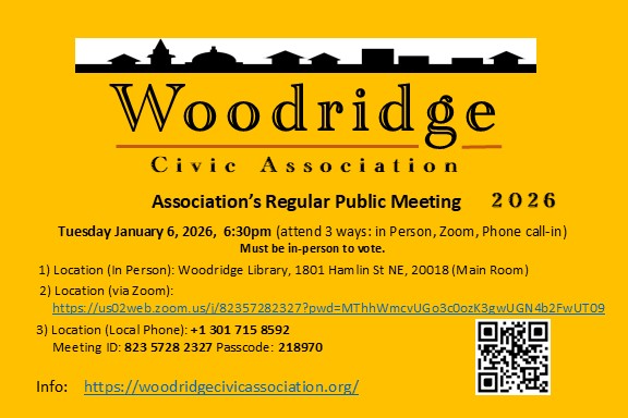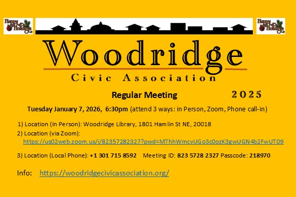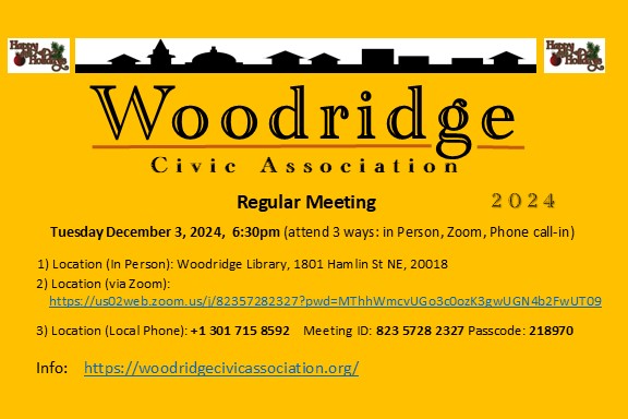 Woodridge Civic Association Regular Meeting, in-person, via Zoom Teleconference, and via Telephone call-in, Tuesday, December 3, 2024 6:30 pm, Woodridge Library, 1801 Hamlin St NE, 20018