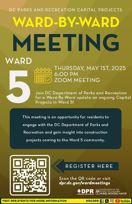 D.C. Department of Parks and Recreation, DPR May 1 Ward 5 Construction Updates Meeting, Thursday May 1, 2025, 6:00 PM (Virtual only), Registration required, Link: https://dc-gov.zoom.us/webinar/register/WN_Ai6tE58wQOuou1_TV0JoiA