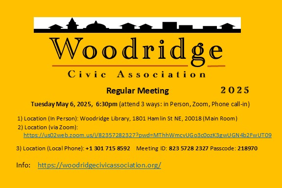 Woodridge Civic Association Regular Meeting, in-person, via Zoom Teleconference, and via Telephone call-in, Tuesday, June 4, 2024 6:30 pm, Woodridge Library, 1801 Hamlin St NE, 20018
