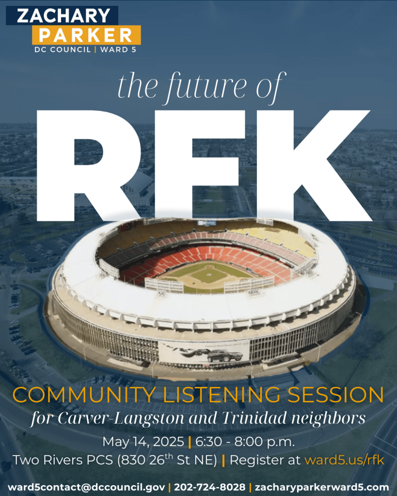 - Focused on Carver-Langston and Trinidad neighbors, this meeting will be a chance for residents to share their thoughts and priorities ahead of development at the RFK Stadium Site. We will be joined by guests, TBA.
