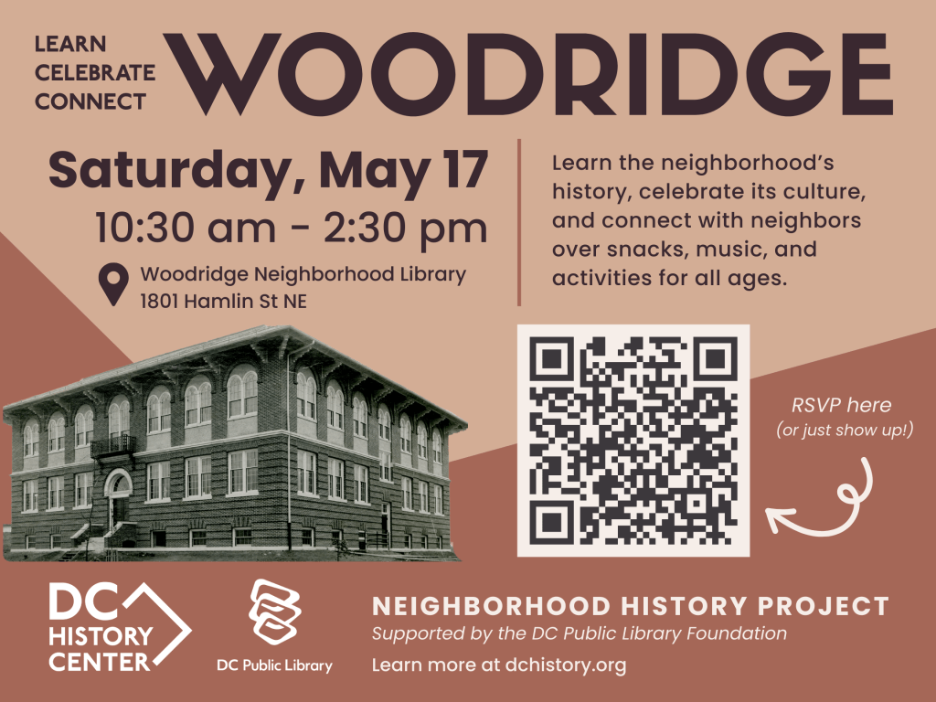 Join the DC History Center at the Woodridge Neighborhood Library on May 17, to learn the history of the neighborhood, celebrate its culture, and connect with neighbors over snacks, music, and activities for all ages. Drop by between 10:30 am and 2:30 pm to learn something new about the neighborhood or share what you know! The schedule will be updated as activities are finalized.