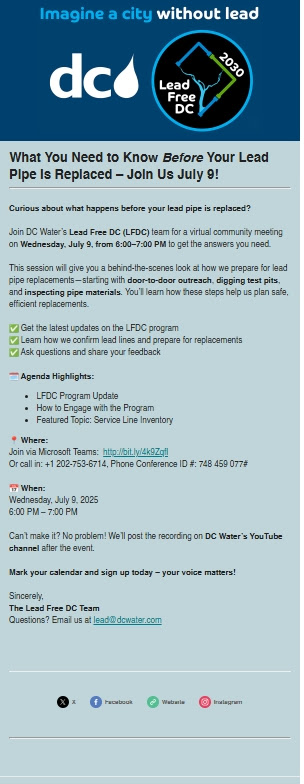 DC Water, Lead Pipe Replacement, July 9, 2025 at 6pm – 8pm (Virtual).