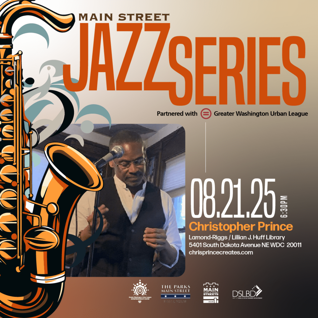 Evening of Jazz; The Main Street Jazz Series continues on Thursday, August 21, 2025 at 6:30 PM with a special performance by Christopher Prince, August 21, 2025 at 6:39pm, Location: Lamond-Riggs/Lillian J. Huff Neighborhood Library, 5401 South Dakota Avenue, NE