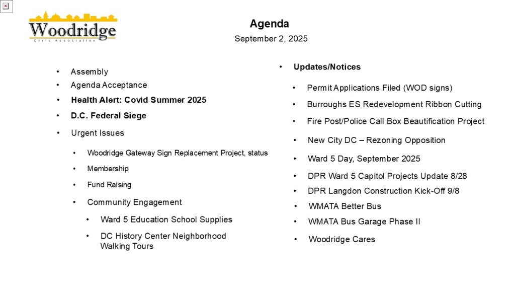 - 1) WMATA Better Bus 2025 and Impacts on Woodridge/Northeast Washington DC,