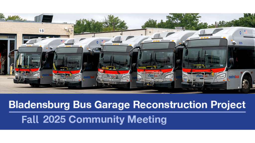 Bladensburg Bus Garage Reconstruction Project Spring Community Meeting, (Virtual Only) May 14, 2025, 6:00 PM, registration required (link; https://wmata.us6.list-manage.com/track/click?u=cc1120462ae411391fa54e28d&id=f647444afb&e=c82b5e4013