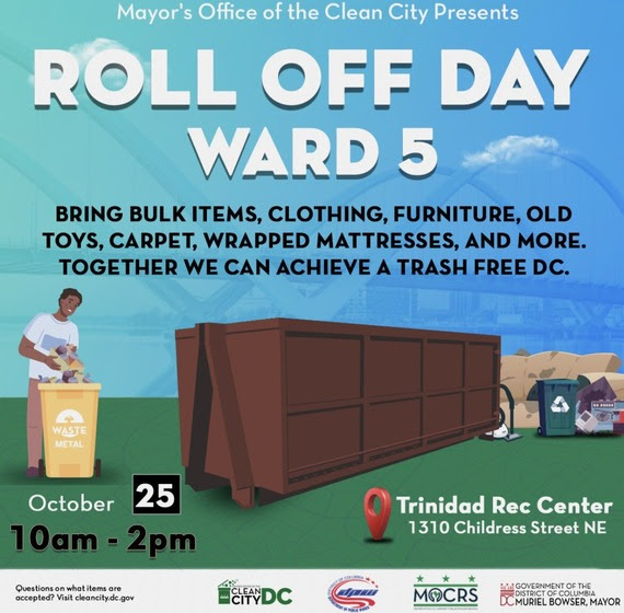 DPW will hold a Community Bulk Item Pickup for Ward 5, Saturday October 25, 10am-2pm at the Trinidad Recreation Center, 1310 Childress Street NE., Bring bulk items & clutter for disposal—let’s work together to keep our city clean!