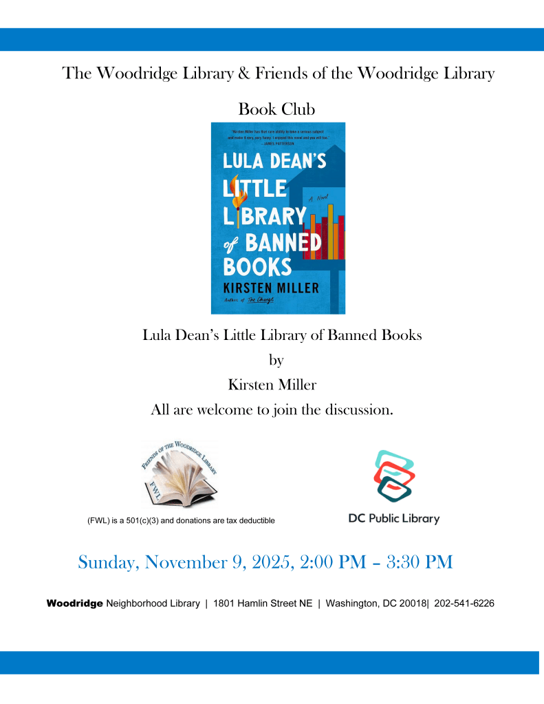 Friends of the Woodridge Library and the Woodridge Library will hold a Book Club Meeting, Sunday, November 9, 2025, 2pm-3:30pm, Location: Woodridge Library, 1801 Hamlin St NE. The Club’s Book Selection is Lula Dean’s Little Library of Banned Books., by Kirsten Miller. All are welcome to Join the Discussion.