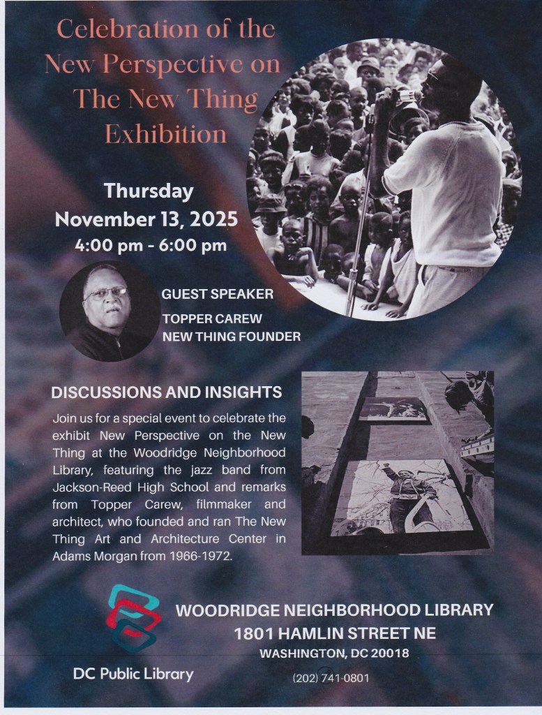 Woodridge Library will hold a “Celebration of the New P4erspective on The New Thing Exhibition”, Guest Speaker, Topper Carew, New Thing Founder, on Thursday, November 13, 2025, 4pm-6pm, Location: Woodridge Library, 1801 Hamlin St NE, Main Meeting Room