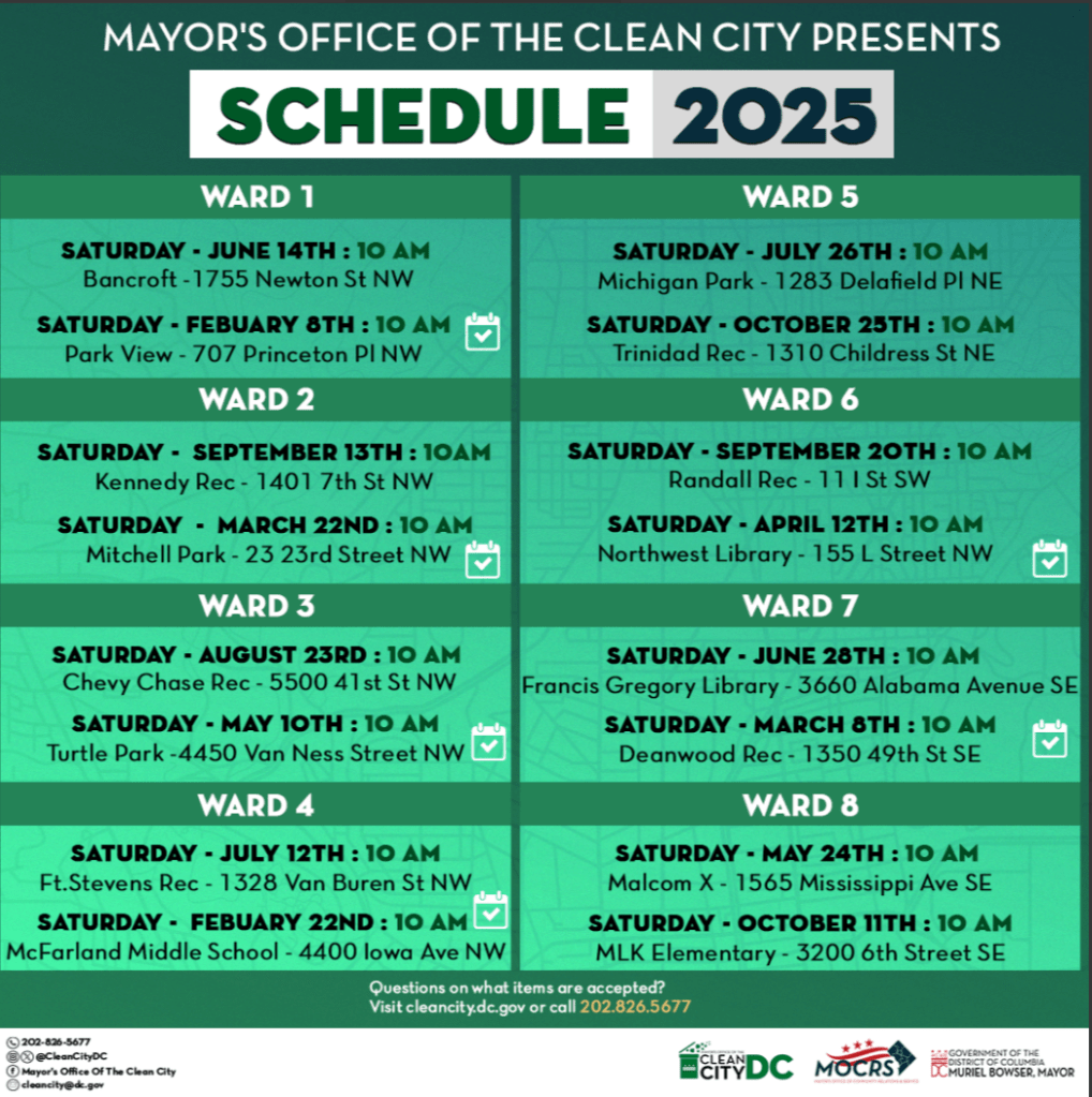 Mayor’s Office of Clean City 2025, Schedule (Next Ward 5 event, Trinidad Rec, 1310 Childress Street NE, October 25, 2025, 10am), for more information, https://communityaffairs.dc.gov/publication/clean-city-roll-schedule-2025