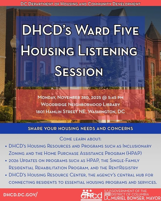 D.C. Department of Housing and Community Development (DCHD), Ward 5 Listening Session., to learn about the District’s housing resources and programs, learn about updates on the District’s progress on affordable housing, and share your housing needs and concerns. This is a chance and opportunity to hear from DHCD. For more information and to register for any of the Housing Listening Sessions, visit DHCD’s Ward 5 Housing Listening Session 2025.