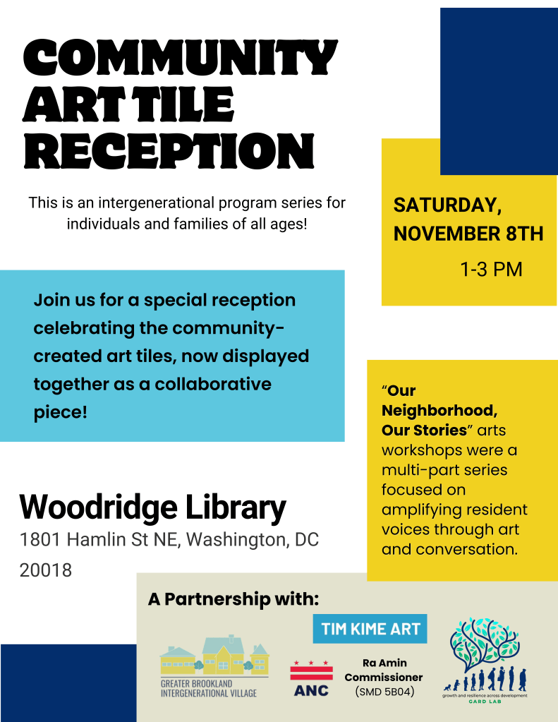 Art Tiles Reception: What: Over the last year, we’ve had the joy of collaborating with artist Tim Kime, Commissioner Ra Amin, DCPL, and the Greater Brookland Intergenerational Village to gather over 200 community-created art tiles. Join us to celebrate the “Our Neighborhood, Our Stories” series and see the art tiles displayed together! When: November 8th, 1 – 3pm, Where: Woodridge Library (1801 Hamlin St NE