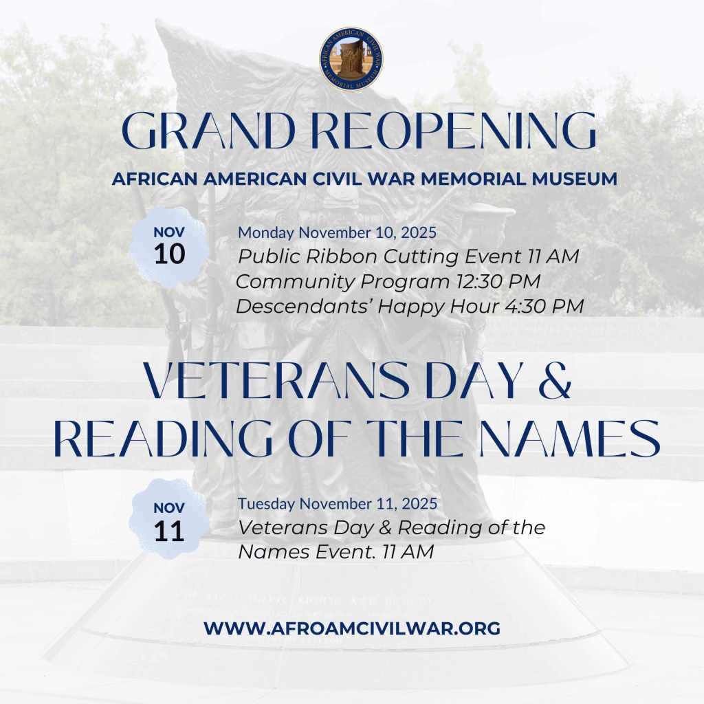 African American Civil War Memorial Museum will hold a Grand Re-Opening Ribbon Celebration, Monday, November 10, 2025, 11am, Location: 1925 Vermont Avenue Northwest, Washington, DC, 20001Significance: The re-opening marks the completion of a renovation to enhance the visitor experience with new exhibits and displays about the United States Colored Troops and the struggle for freedom. More information is available at https://www.afrocivilwar.org