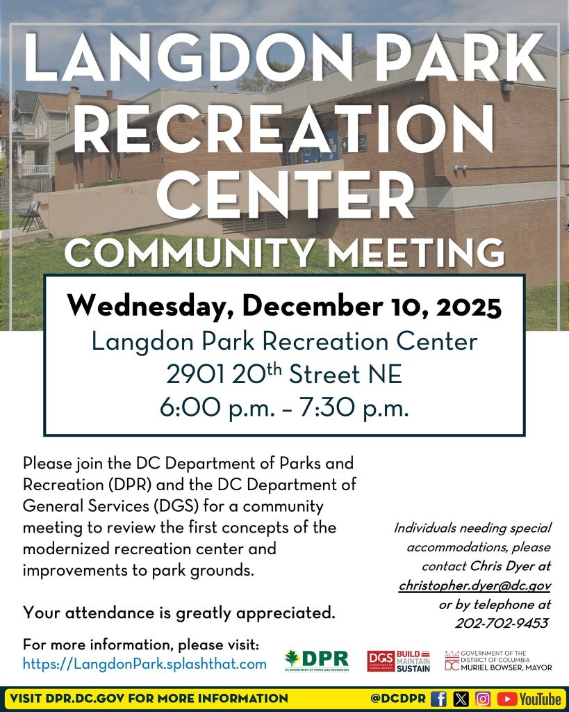 DPR Langdon Park Community Center Construction Kick-off Meeting – Monday, September 8, 2025, This is an in-person only, 6:30 pm – 8:00 pm. 2901 20th Street NE. Show up. Be Present, Be heard!, RSVP, hhttps://forms.office.com/Pages/ResponsePage.aspx?id=8Unkj5SLt0-ZBm-Tnagtc_myyzzTfjZAu3mqLOlcVz9UOEpXWFFDTzZVVVlYS0JZRDQwQ0NBNUJWNi4uttps://dpr.dc.gov/stakeholder