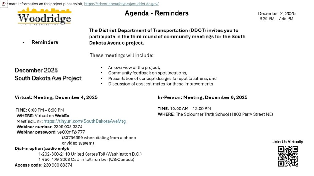 Time: December 4, 2025 06:00 – 08:00 PM Eastern Time (US and Canada), Join Via Webex (https://tinyurl.com/SouthDakotaAveMtg ) , Webinar number: 2309 008 3374, Webinar password: veQXmfYx777 (83796399 when dialing from a phone or video system), Dial In: 1-202-860-2110 United States Toll (Washington D.C.), or 1-650-479-3208 Call-in toll number (US/Canada), Access Code: 230 900 83374