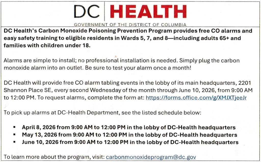 DC Health’s Carbon Monoxide Poisoning Prevention Program providing free CO alarms and easy safety training to elieible residents in Wards 5, 7, and 8 – including adults 65+ and families with children under 18.